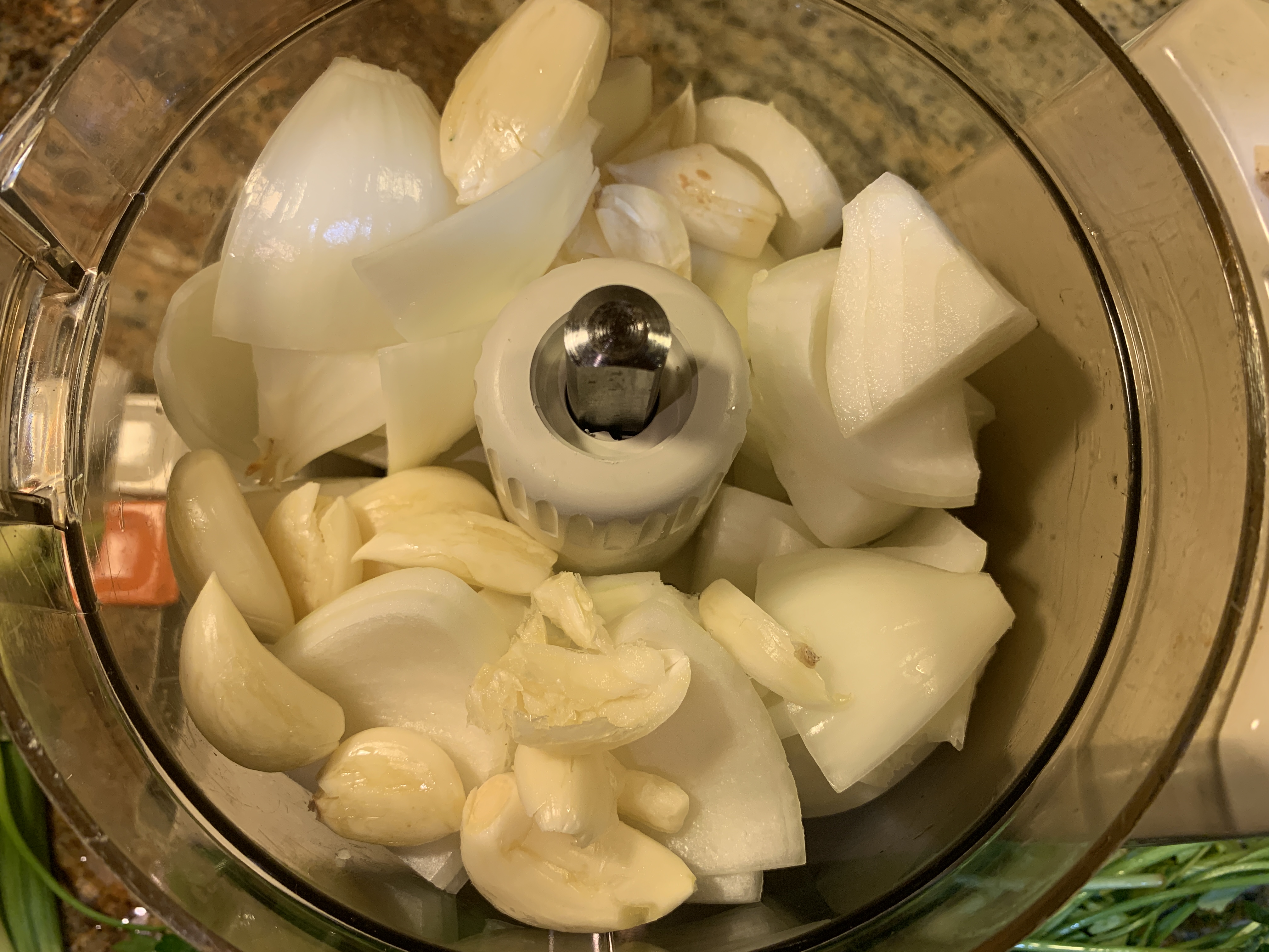 SIMPLE HERB BLEND: Use 2 medium onions and 1 large head of garlic. Pull the leaves off that head of celery you have in the fridge. Wash and top a bunch of scallions. Cut into 2 inch lengths. If you have chives you can add a bunch to this mixture. Wash and cut into 2 inch lengths. Pull the leaves off a few sprigs (8-10 stems) of fresh thyme. Add all herbs to the food processor and proceed as above.