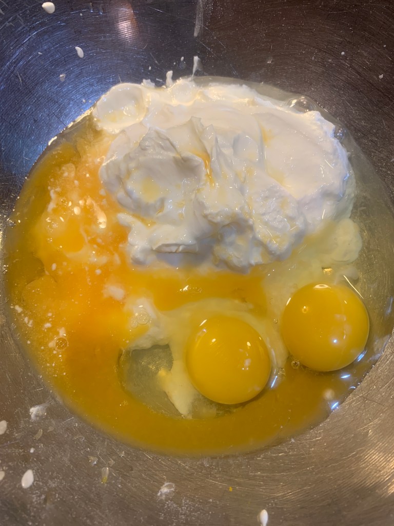 - Squeeze the orange to extract all of the juice. Add the orange juice to the eggs and sour cream. Whisk to blend thoroughly.