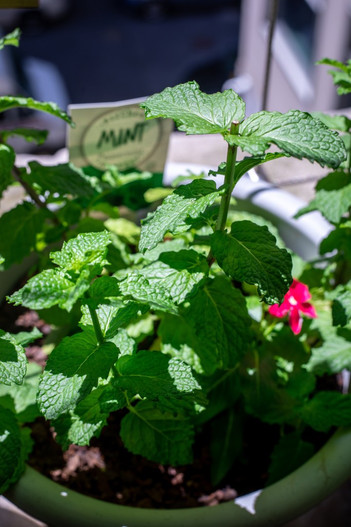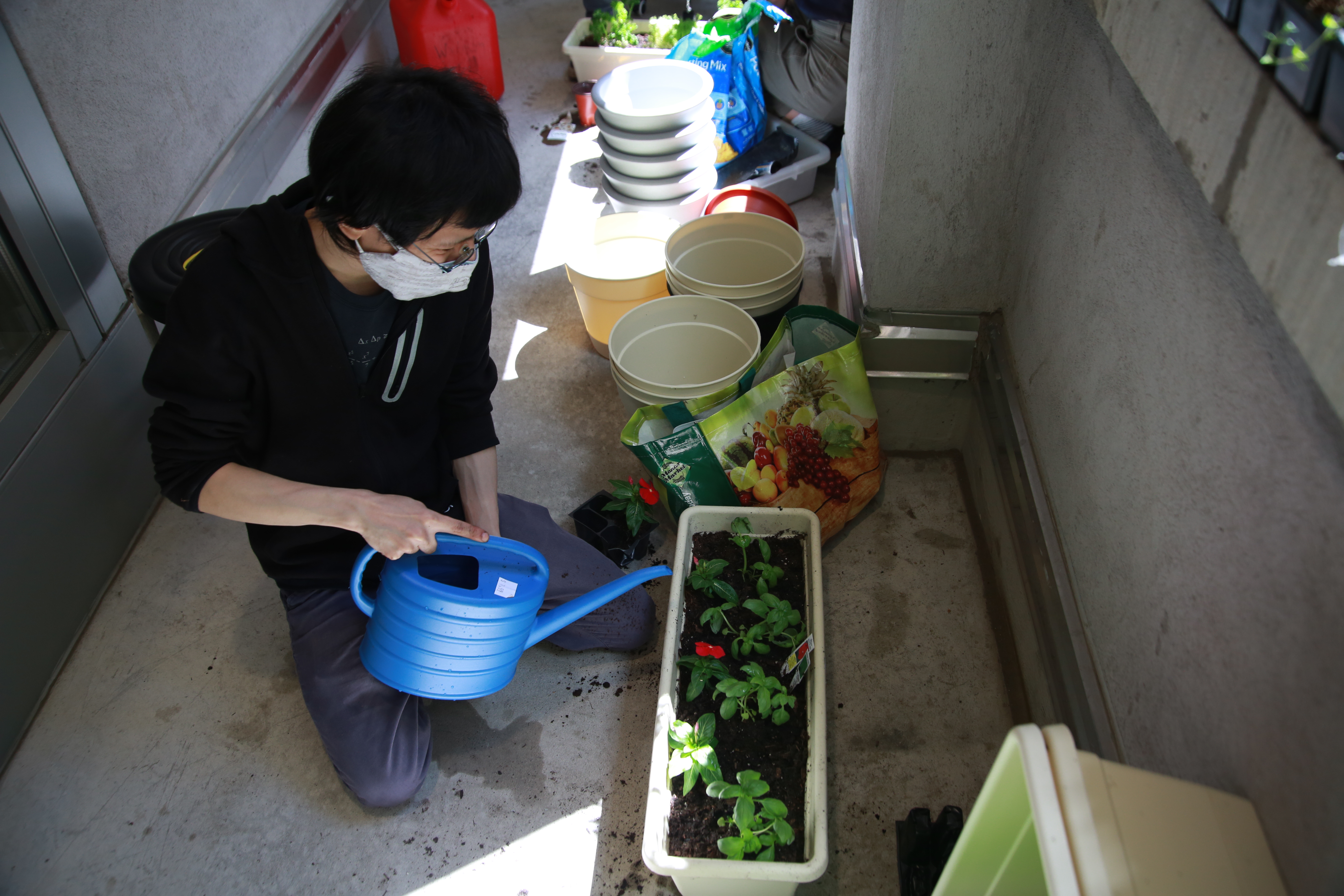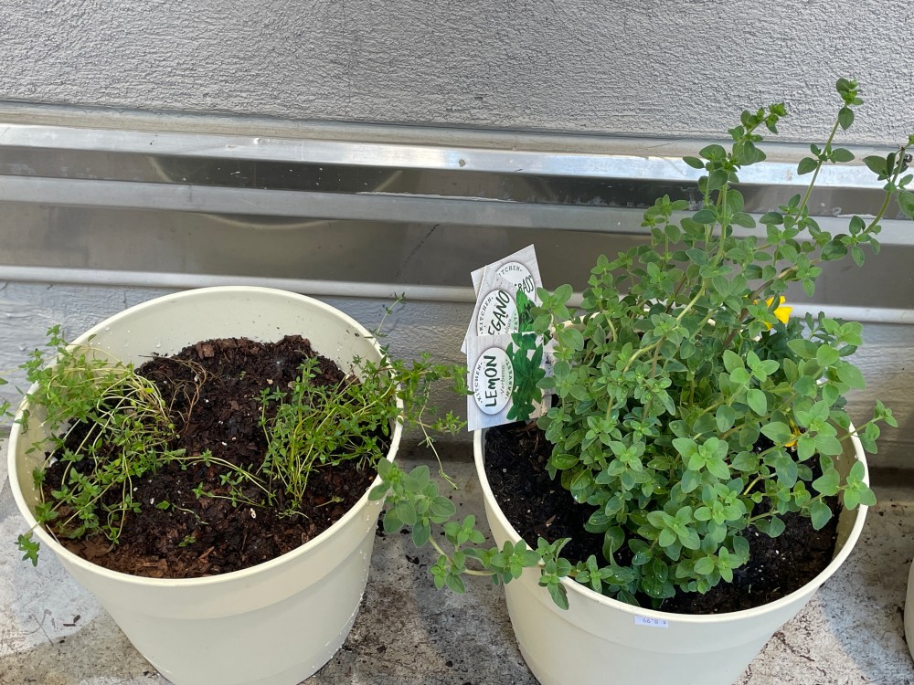 Water the plants. Examine the planters. Touch the soil. Does it seem damp or dry? If it seems dry, fill up the watering cans that are on the balcony and give the herbs some love. It is satisfying… believe me.