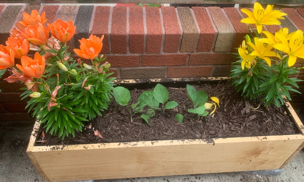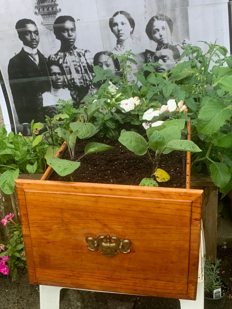 One evening while walking the dog, we saw a set of dresser drawers put out for trash pickup. Upon closer inspection, we realized that they were all wood – not particle board. At this point I had a lot of plants in the backyard waiting to be transplanted, but I kept being discouraged by to cost of quality planters. Inspired by my dumpster diving friend, Debbie, I immediately say the drawers as planters. We returned with the car – much to the incredulity of the family watching us through their front window – and loaded up the boxes.